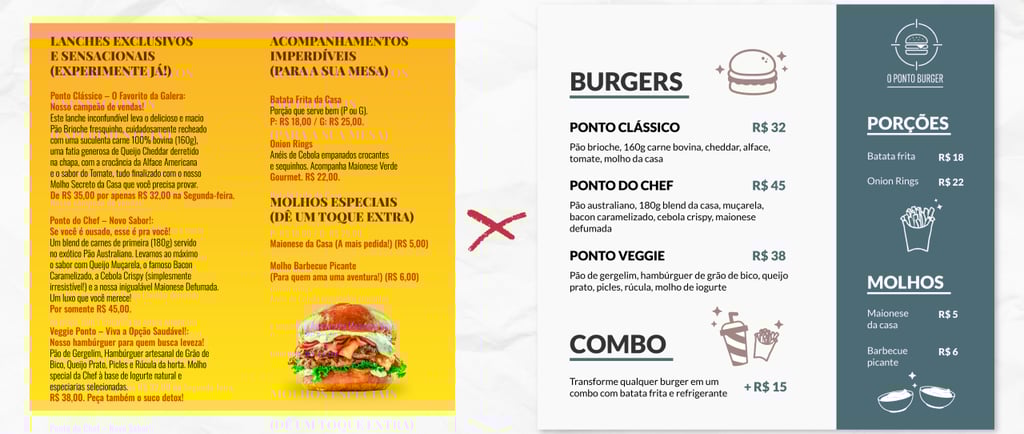 Hierarquia Visual: O uso estratégico de negrito, cores e diferentes tamanhos de fonte que guiam o olhar para o que é realmente crucial.