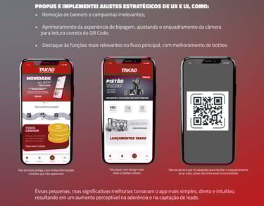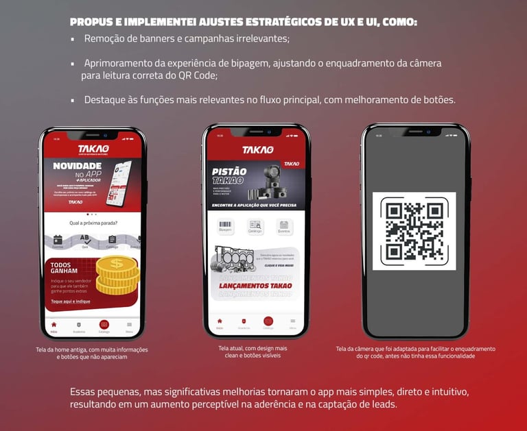 Com base nesses insights, realizamos ajustes no layout, aprimorando a leitura e navegação — incluindo leitura inteligente de QR Code, remoção de banners de campanha e reorganização de informações prioritárias, como a busca de peças por placa e o sistema de pontos para troca de prêmios.